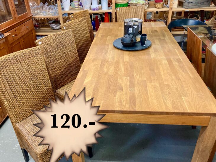 Schöner grosser Esstisch aus Massivholz für Fr 120.-, dazu passend finden Sie bei uns auch 6 Essstühle aus Korbimitat für je Fr 15,- das Stück.