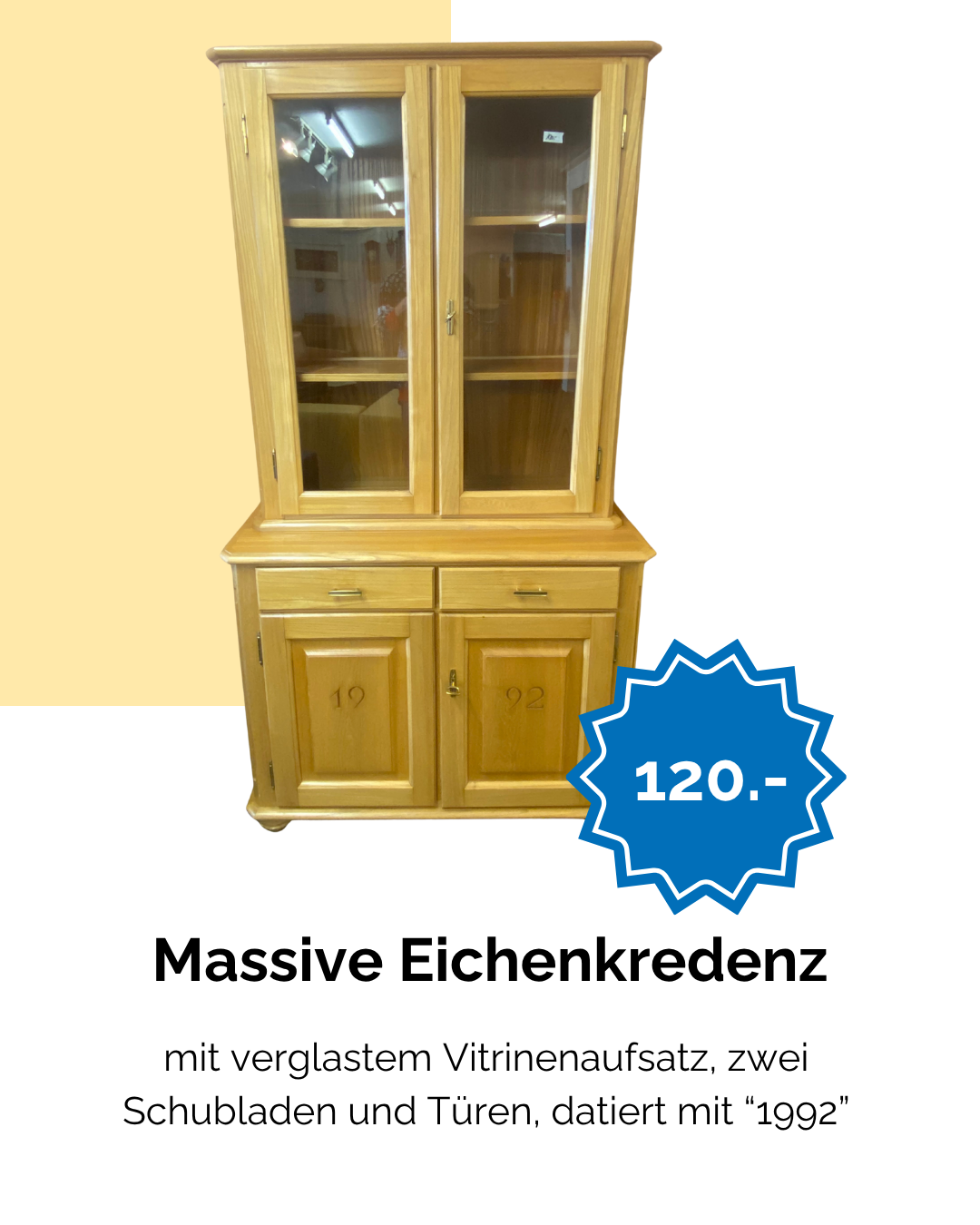mit verglastem Vitrinenaufsatz, zwei Schubladen und Türen, datiert mit “1992”
