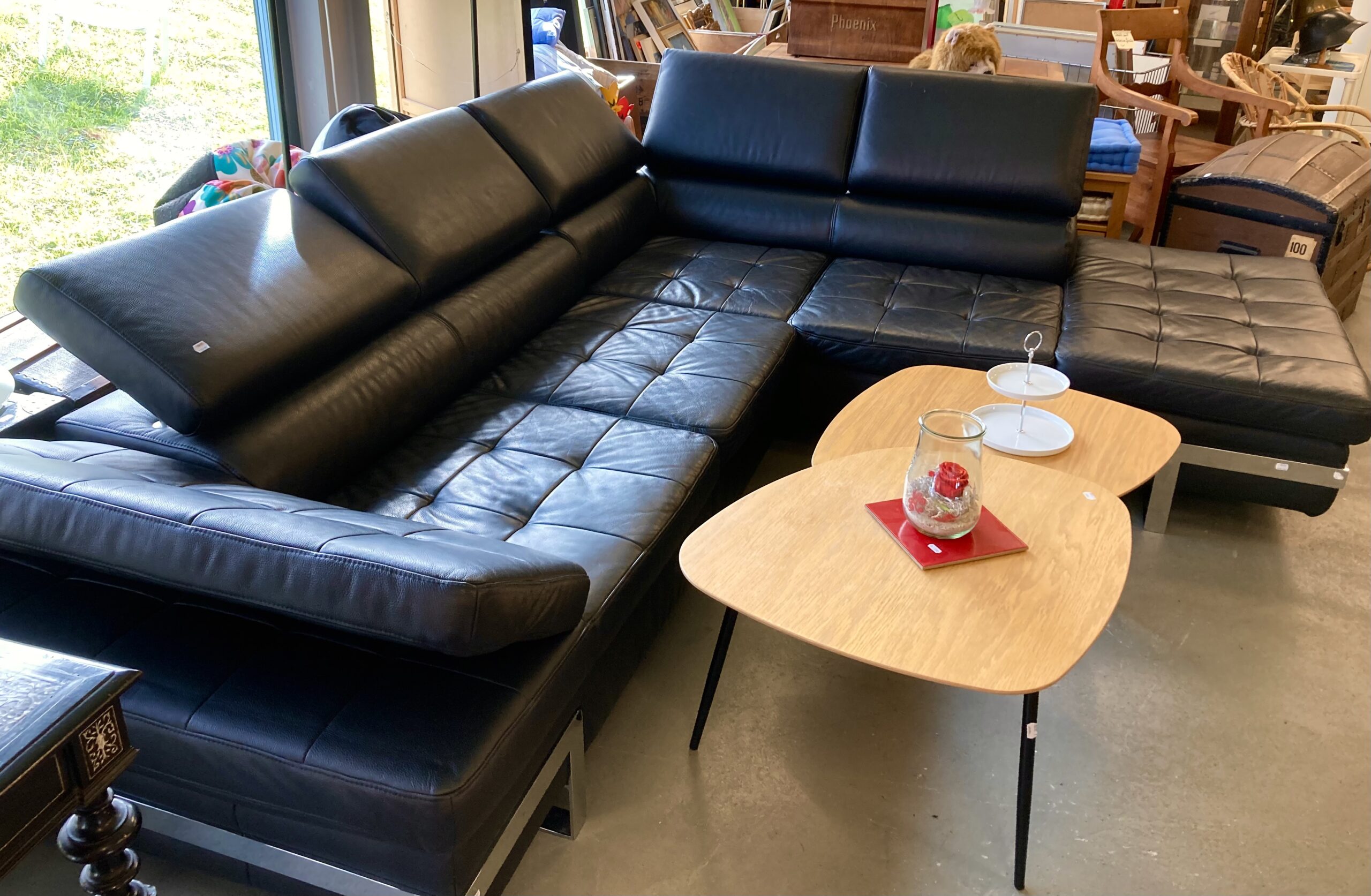 Superkomfortable Eck-Ledercouch in Schwarz mit schönen Chromleisten und einzeln verstellbaren Rückenlehnen. Hoher Neupreis! Zum unschlagbaren Schnäppchenpreis von Fr 280,- nur bei uns! 🥳👍🎉🎉🎉