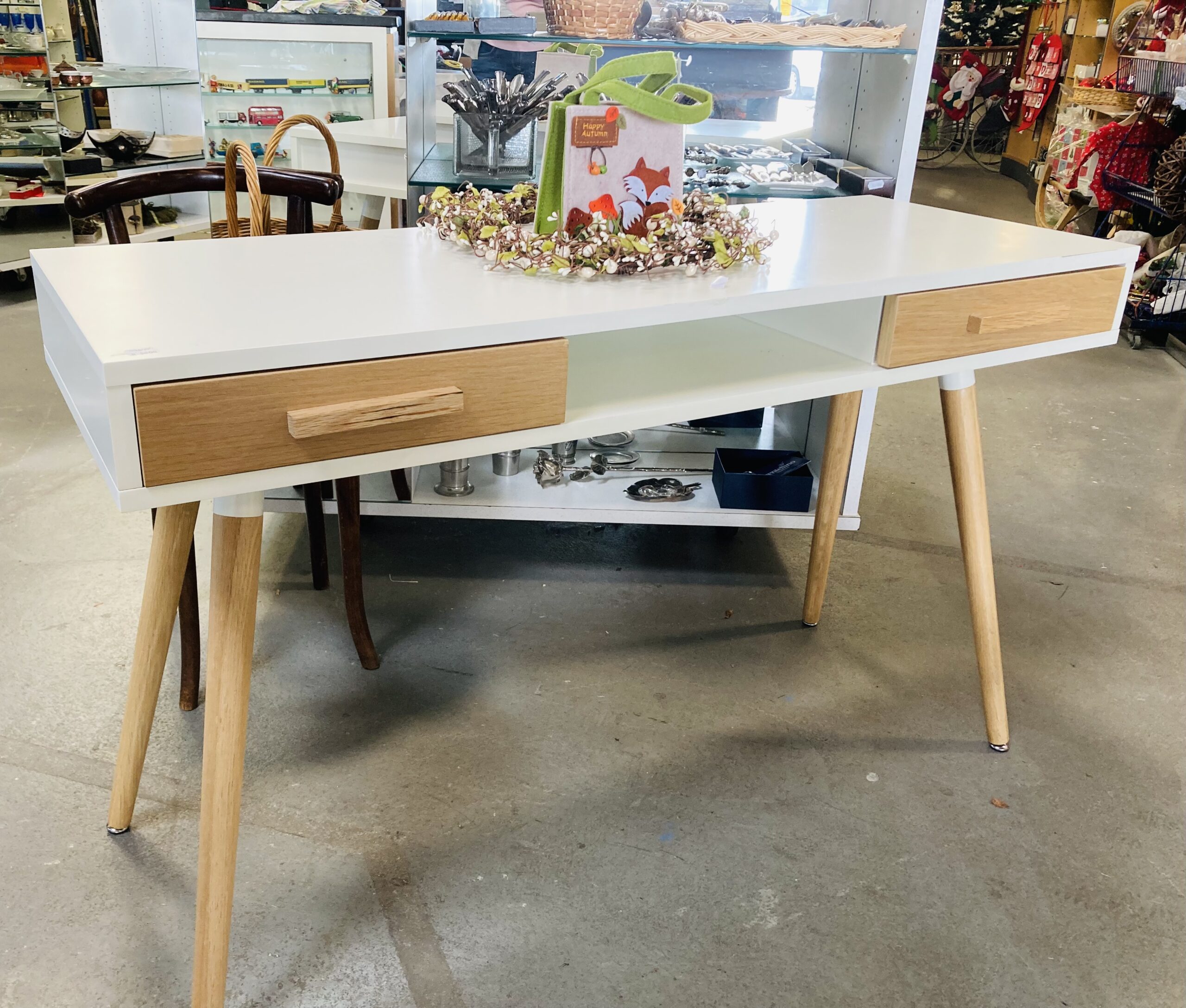 Sehr schöner Schreibtisch (auch nutzbar als Sideboard) im modernen Skandi-Stil, mit Holzbeinen und zwei Schubladen.
